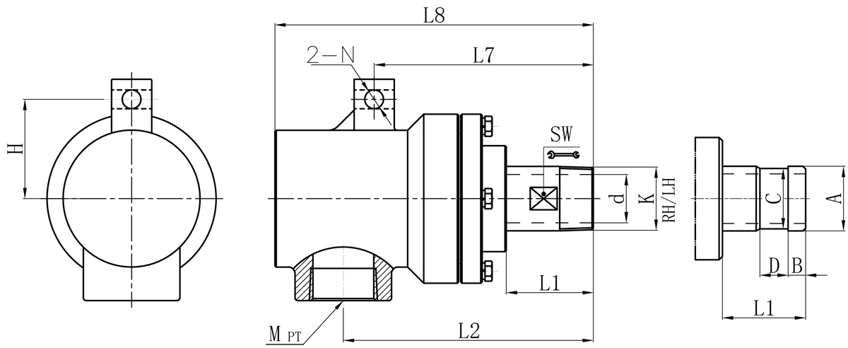 Model | K | M | d | L1 | L2 | L7 | L8 | N | H | SW | 法蘭式外管尺寸對照表 | |||